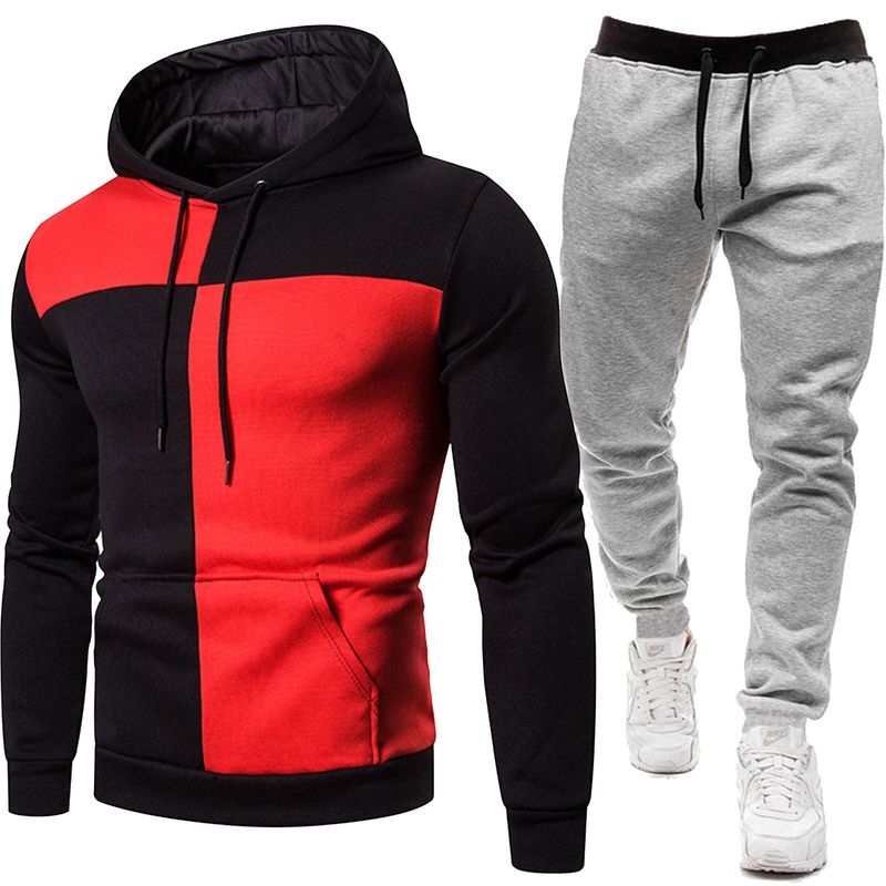 2024 autumn and winter casual hooded jacket men's European size color blocked sweatshirt set