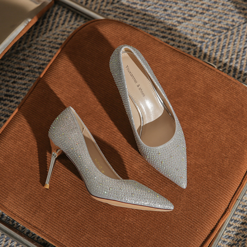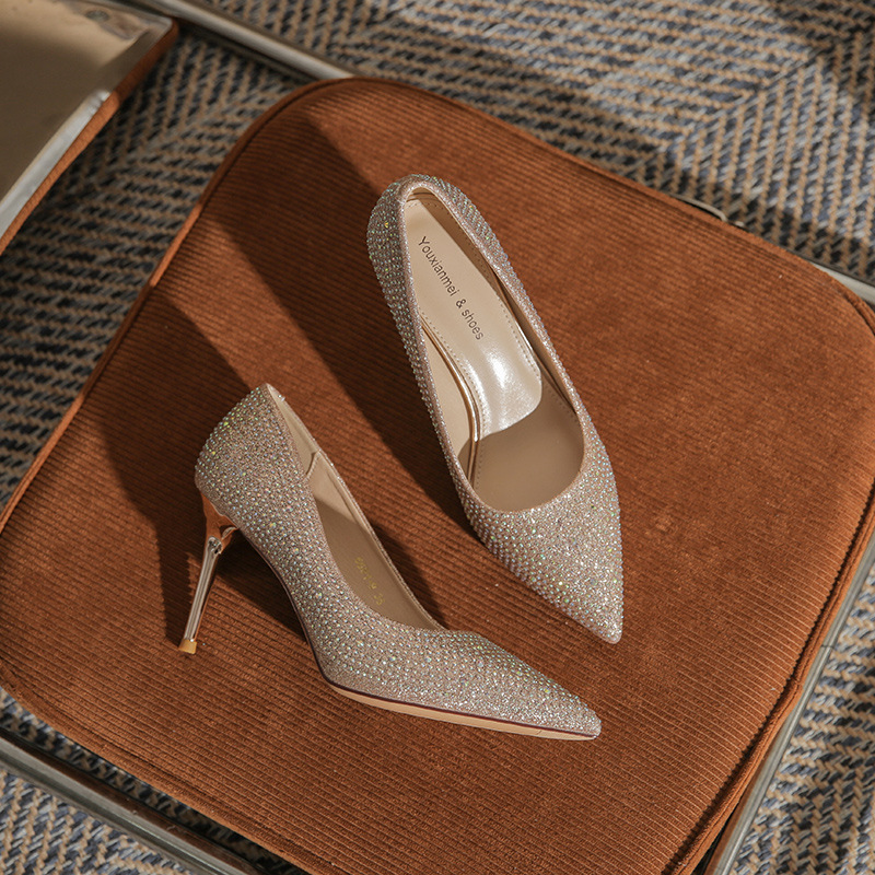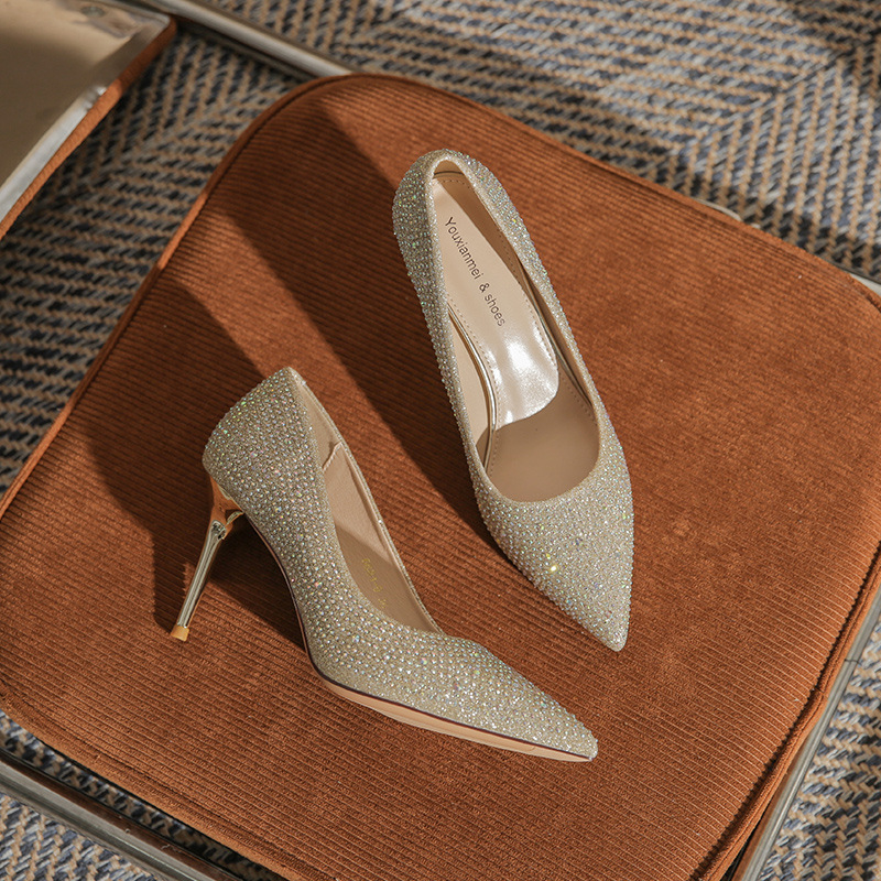 2024 New Water Diamond High Heels Women's Wedding Shoes New Versatile Bright Diamond Women's Shoes Hot Diamond Pointed Thin Heel Shoes