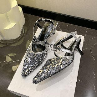 2024 Spring and Summer New Black Sequin Strappy High Heels Women's Stiletto Sandals Pointed Toe Baotou Single Shoes Sexy Sequins