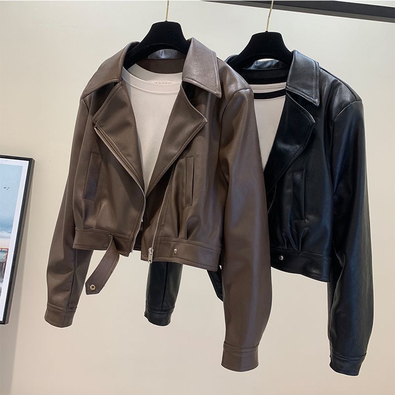 2025 Autumn New Women's Leather Jacket with Turn-down Collar, Petite Short PU Leather Slimming Jacket