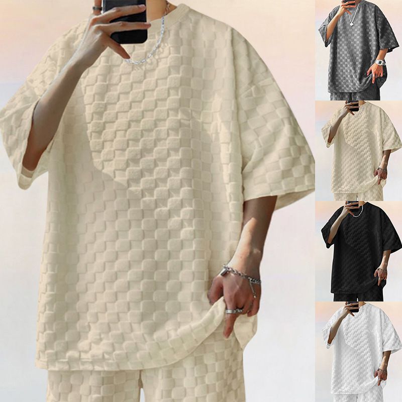 2025 Men's Summer New Round Neck Jacquard Plaid T-Shirt Loose Plus Size Short Sleeve_voghion.com