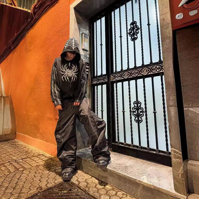 American Style New Y2K Spider Stripe Print Zipper Hoodie Unisex Loose Sweatshirt