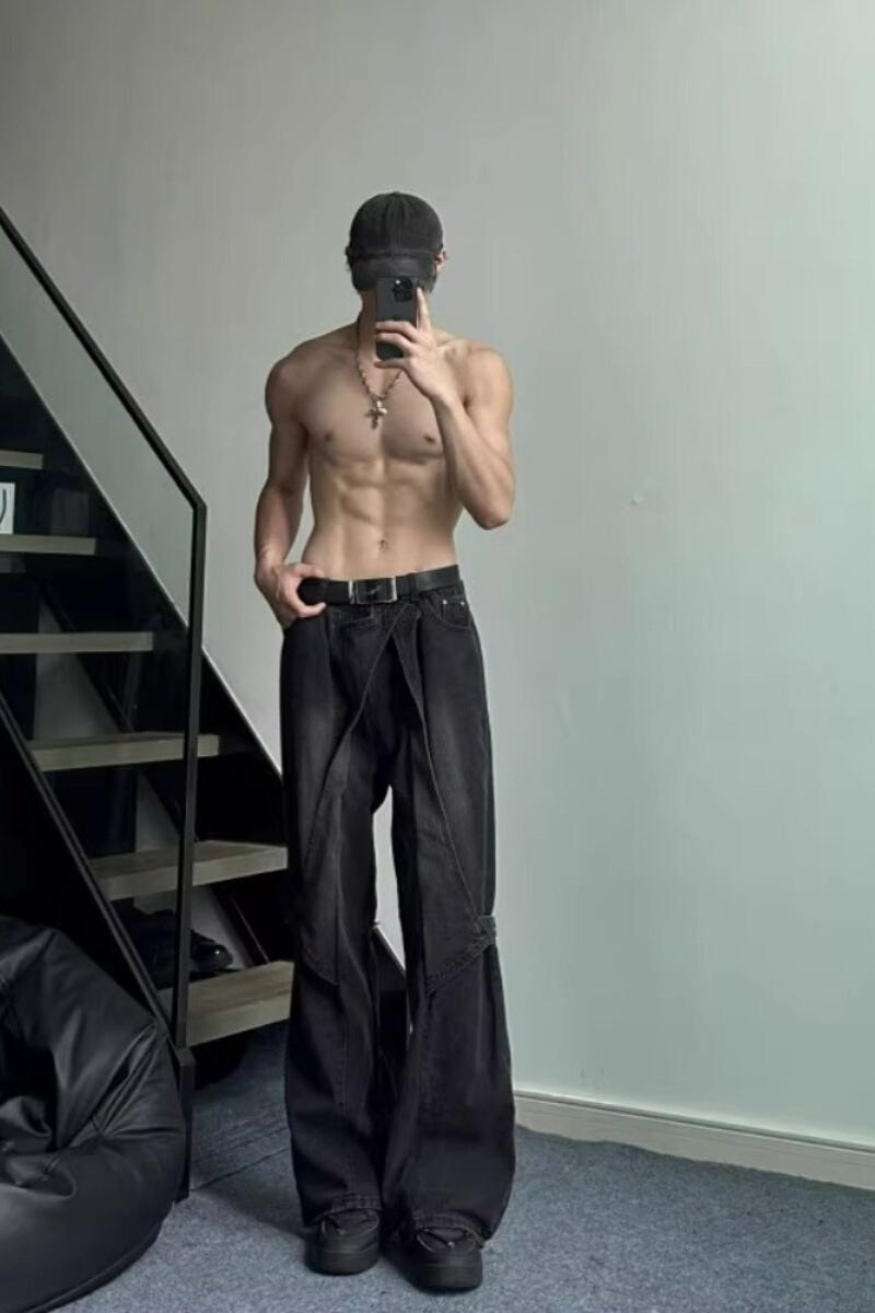 boy Black Cargo Jeans For Men, Design Sense Deconstructed Pants, European And American High Street Tall Flared Pants