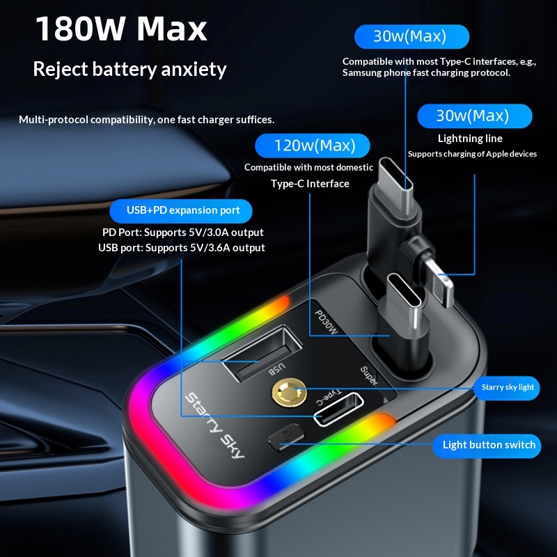 Cross-Border Starry Sky Roof 180W Mobile Phone Charger Super Fast Charging Retractable Cable Car Cigarette Lighter