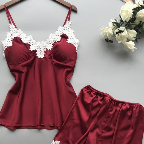 Product Category:Pajamas,Fabric Name:Satin,Design:Set,Main fabric composition:Polyester Fiber Dacron,Thickness:Lightweight,Fabric Thickness and Weight:Thin 101-120g/m²,Collar Style:V-neckline,Sleeve Length:Sleeveless,The length of the pants:Shorts,Functionality:Casual, breathable, sleep, bath, stretchy, home, cool,Time to market:Spring 2022,Suitable for the season:Summer, Spring, Autumn,Applicable to all categories of people:Ladies,Applicable Scenarios:Home, Hotel Bathhouse,Color:Yellow, green, burgundy, pink, black, peacock blue,Size:S,M,L,XL,2XL,Brand:Mousse language,Origin:Guanyun,Item Number:A007,Is it exclusively for cross-border export supply?:yes,Main fabric ingredient content:95% included - 100% excluded,Style:Luxurious and Elegant