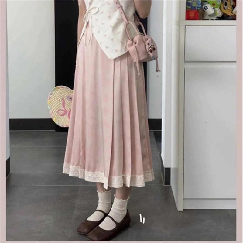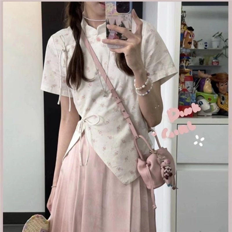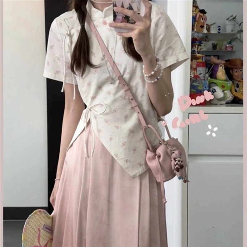 ChicShe Two-Piece New Chinese Style Floral Stand Collar Shirt For Women + Pink Bamboo Pleated Skirt Set