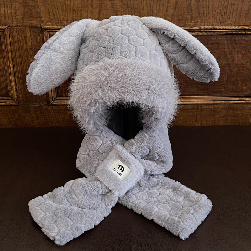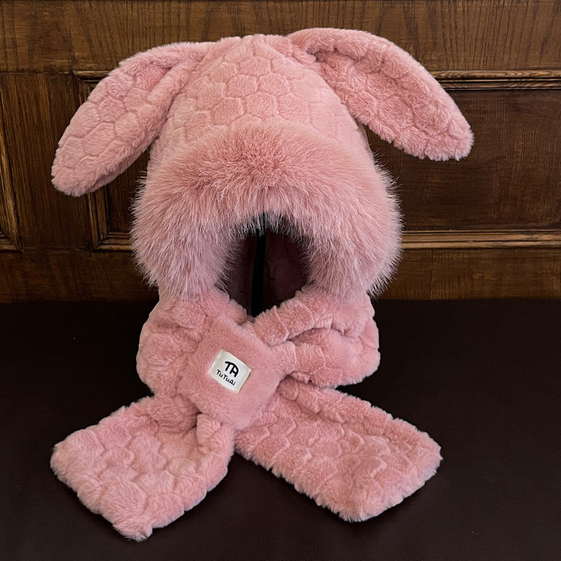 Cute Bunny Scarf Combo For Women Winter Korean Style Face Slimming Fleece Lined Thickened Plush Ear Protection Lei Feng