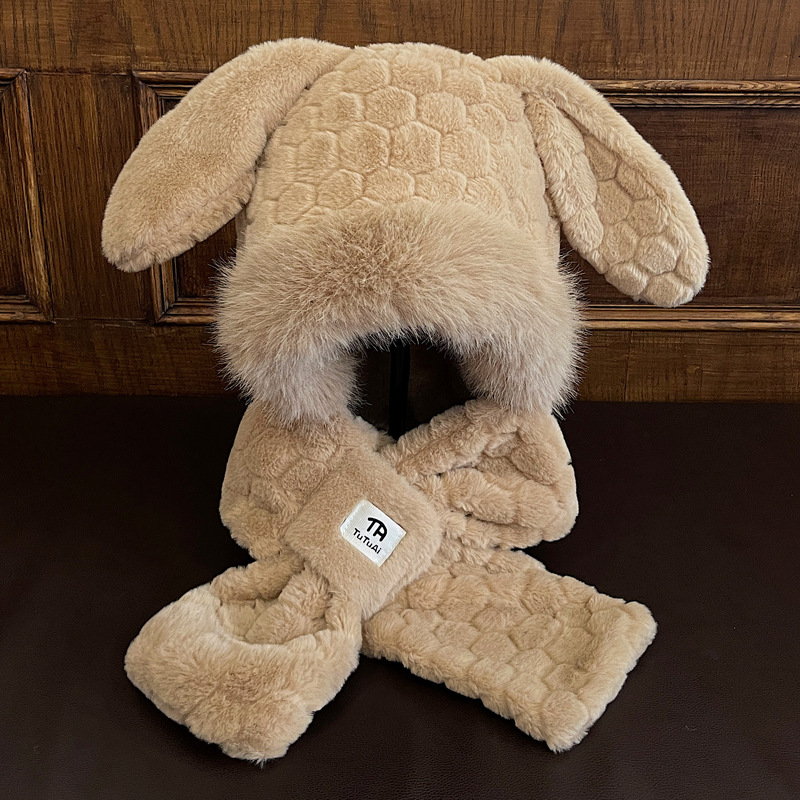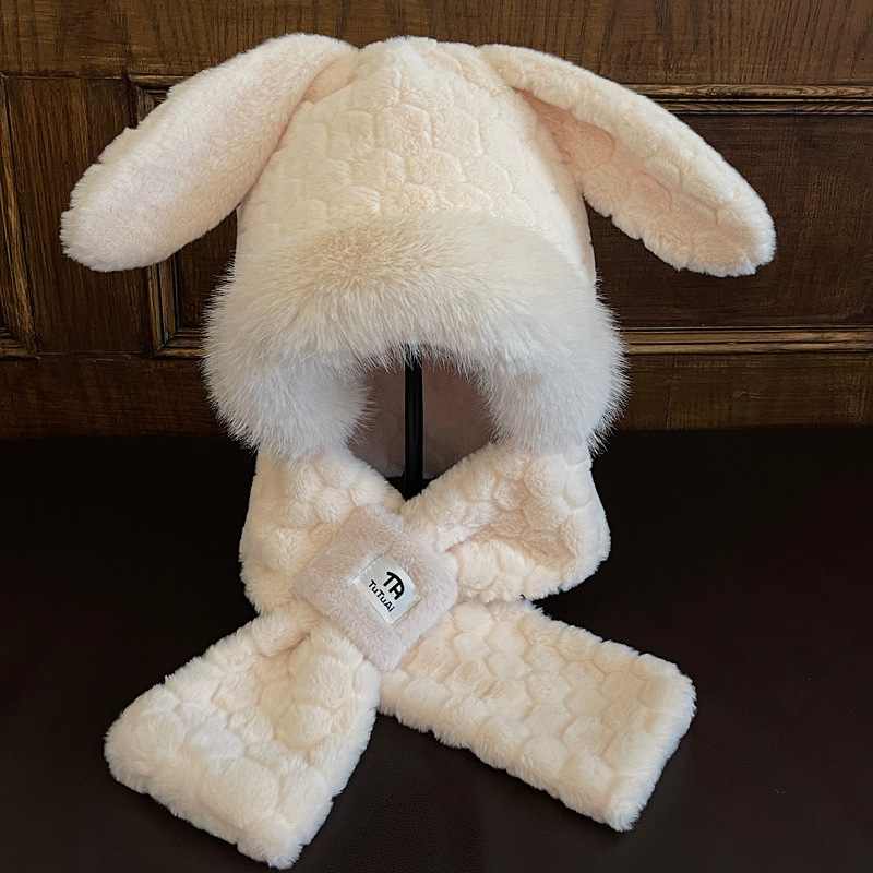 Cute Bunny Ear Hat Scarf Combo for Women Winter Korean Style Face Slimming Fleece Lined Thickened Plush Ear Protection Lei Feng Hat