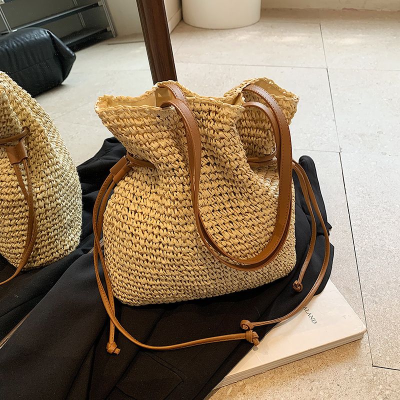 Drawstring Closure Women's Single Shoulder Woven Bag Trendy Fashion Straw Bag Beach Bag Bucket Bag for Women