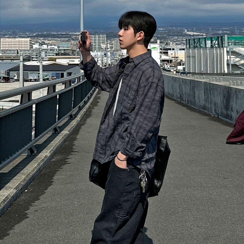 Product Source Category:In Stock,Brand:THE OTHER/Other things,Item Number:220216,Fabric Name:Cotton 1,Material function:other,Fabric Thread Count:Cotton 1,Style:Korean Style,Bargain Category:Youth Fashion 18-24 Years Old,Design 1:Cardigan,Design:Loose Fit,Collar Style:Turn-down Collar,Sleeve Length:Long Sleeve,Pattern:Grid,Thickness:Average,Is it in stock?:yes,Inventory Type:Complete order,Design details:Buttons,Suitable for everyone:Youth,Year/Season of Release:Autumn 2024,Main fabric composition:Cotton,Content of the main fabric components:100,Applicable Scenarios:Casual,Color:Blue, dark gray,Size:M, L, XL, 2XL,Suitable for the season:Autumn,Craftsmanship:Printed/Dyed,Original Design Source:No,Is there a quality inspection report?:No,Suitable age group:adult,Applicable Gender:Male,Product Category:Shirt
