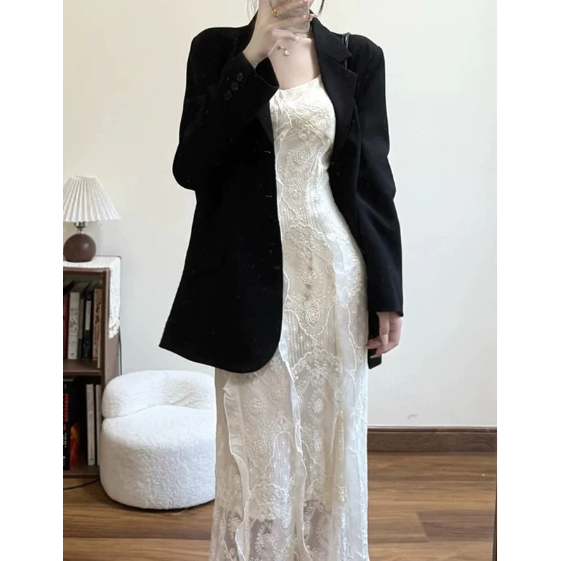 GraceChic 2025 Autumn Korean Style Lazy Elegant Super Fairy Strap Dress With Casual Blazer Fashion Two-Piece Set For Women