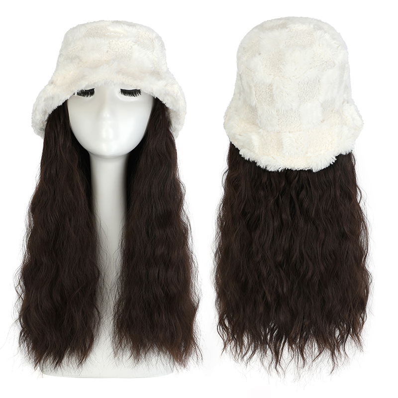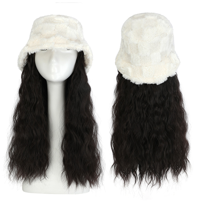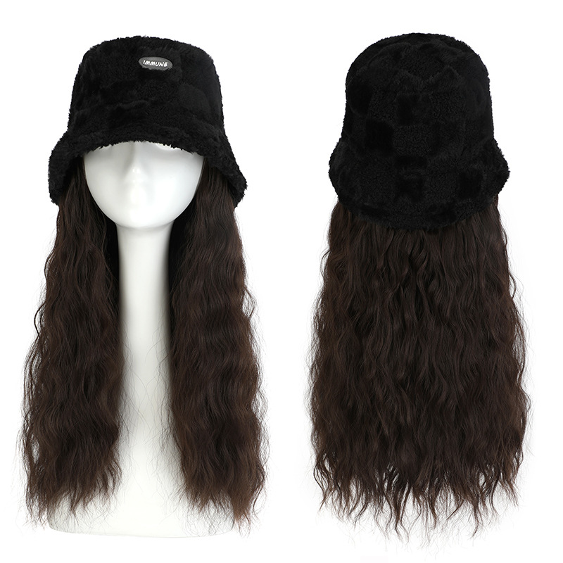 Hat, Wig, All-in-one Autumn and Winter New Plush Checkerboard Fisherman Hat, Corn Whisker Curly Hair, Women's Full Set Wig Hat