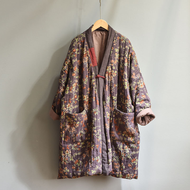 Hua Xizi/Original Large Size Women's Clothing Retro Washed Printed Cotton Linen Patch Button Cotton Coat Mid-Length Cotton