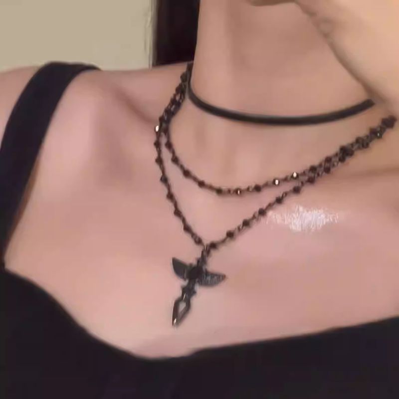 Leather Crystal Cross Wing Pendant Necklace Three-Piece Set Dark Style Collarbone Chain Niche Design Sense Choker For