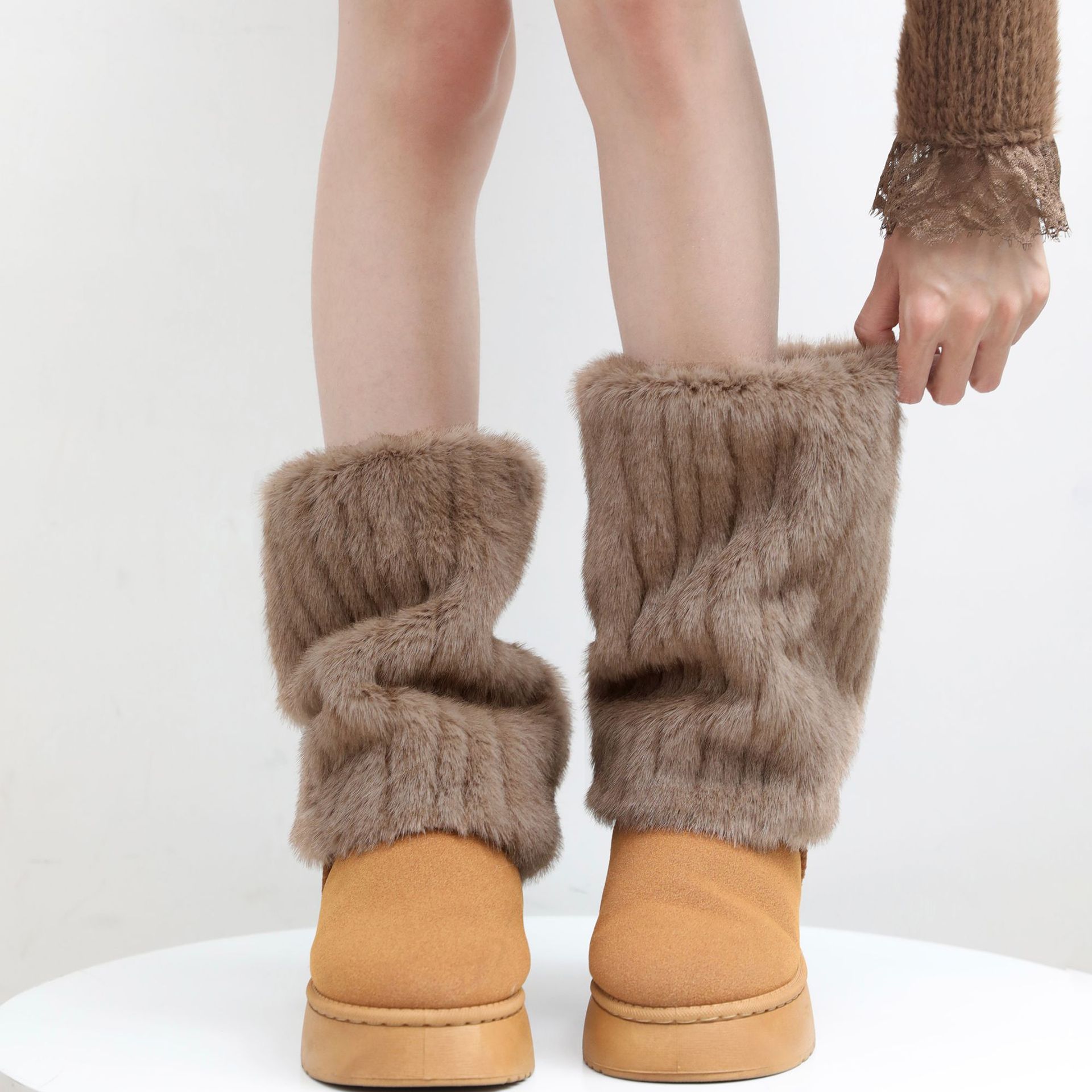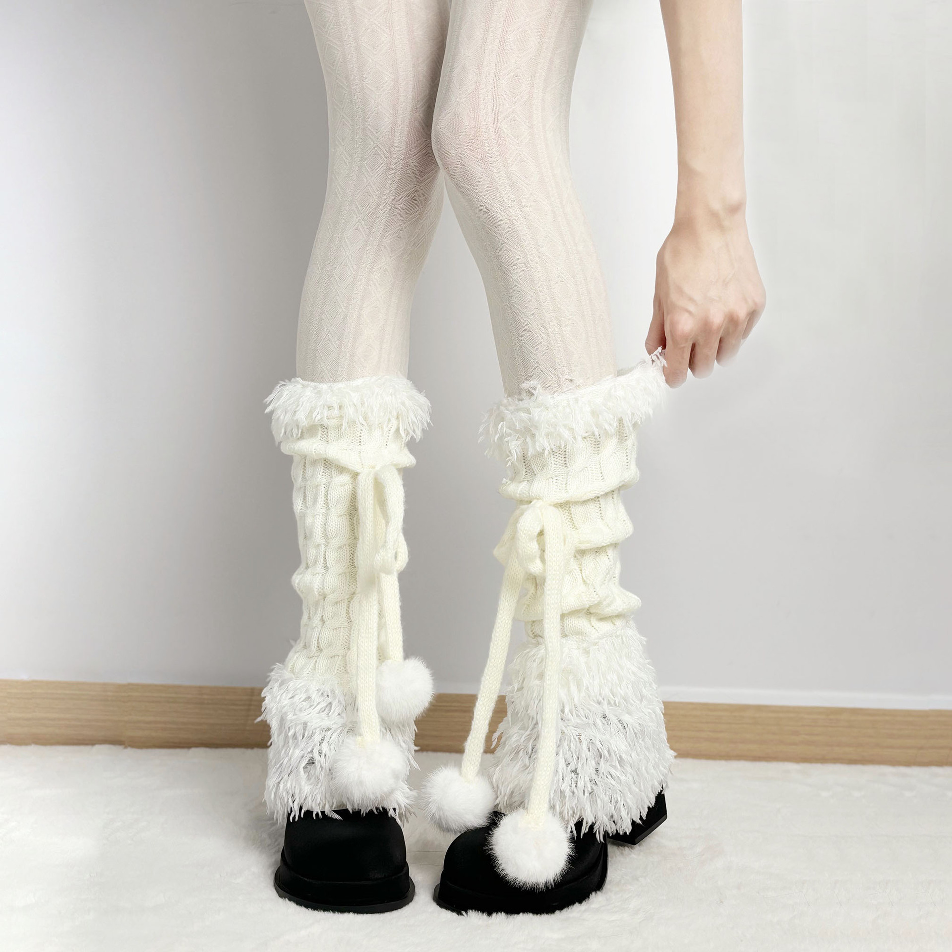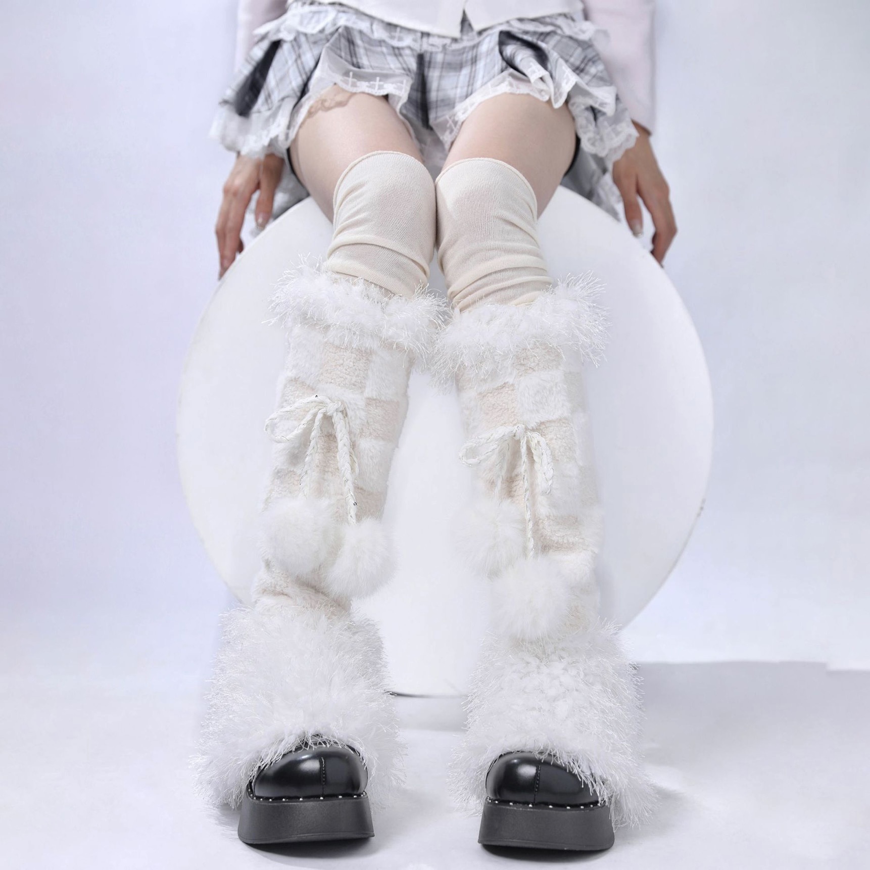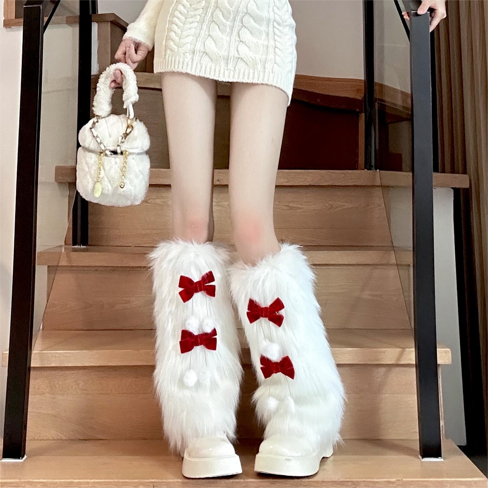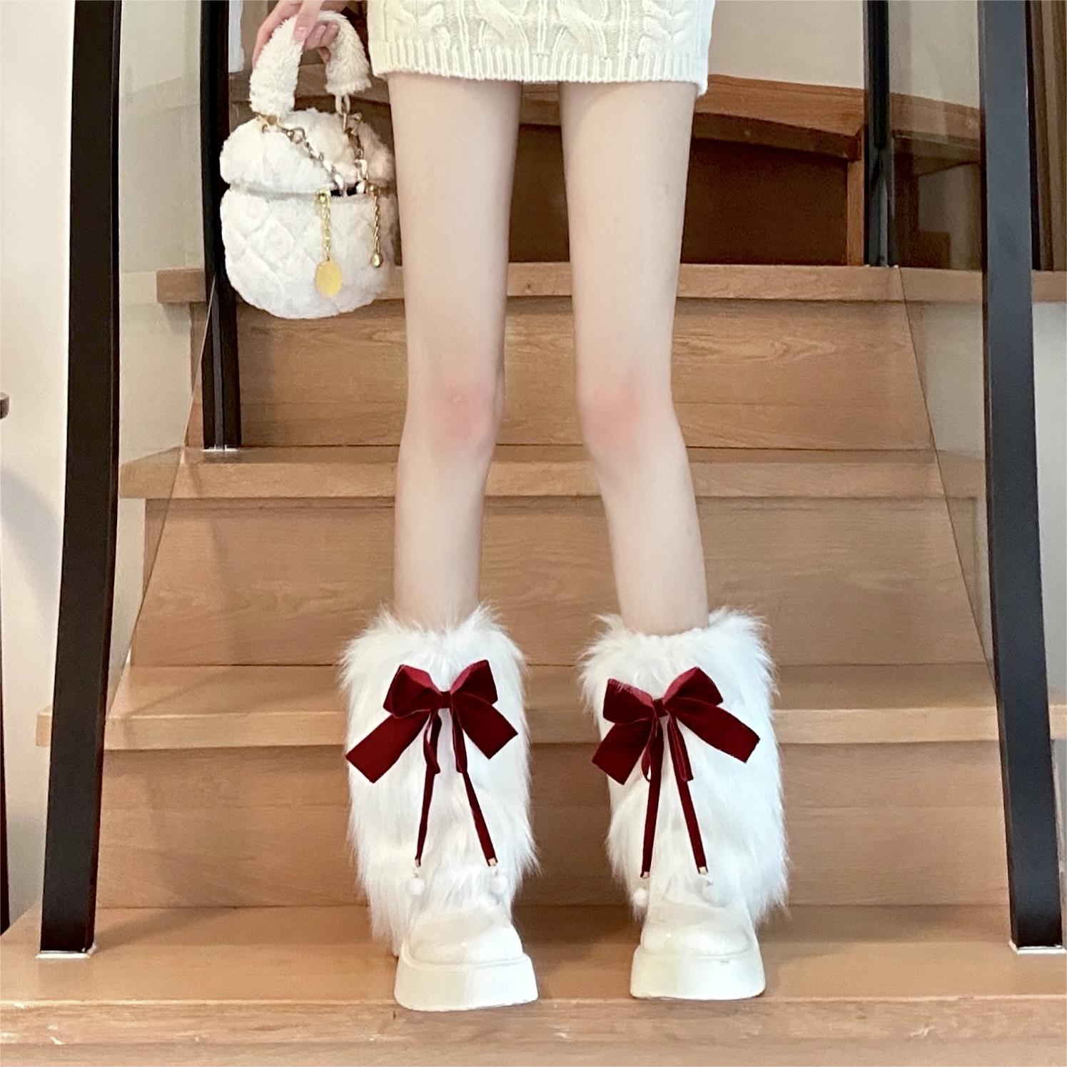 Leg Warmers Autumn And Winter Thick Warm Plush Socks Y2k Hot Girl Bow Tie Imitation Teddy Fur Niche Pile Calf Cover