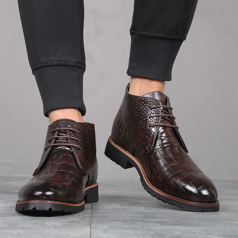 Men's Pointed Casual Leather Boots, Front Lace Up Breathable, Mid Heel, Large Martin Boots, Men's Shoes