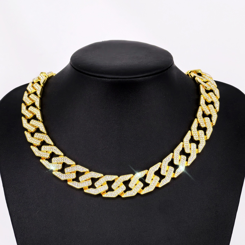 New hip-hop style 17mm flat wire simple trendy Cuban chain full diamond necklace large gold chain