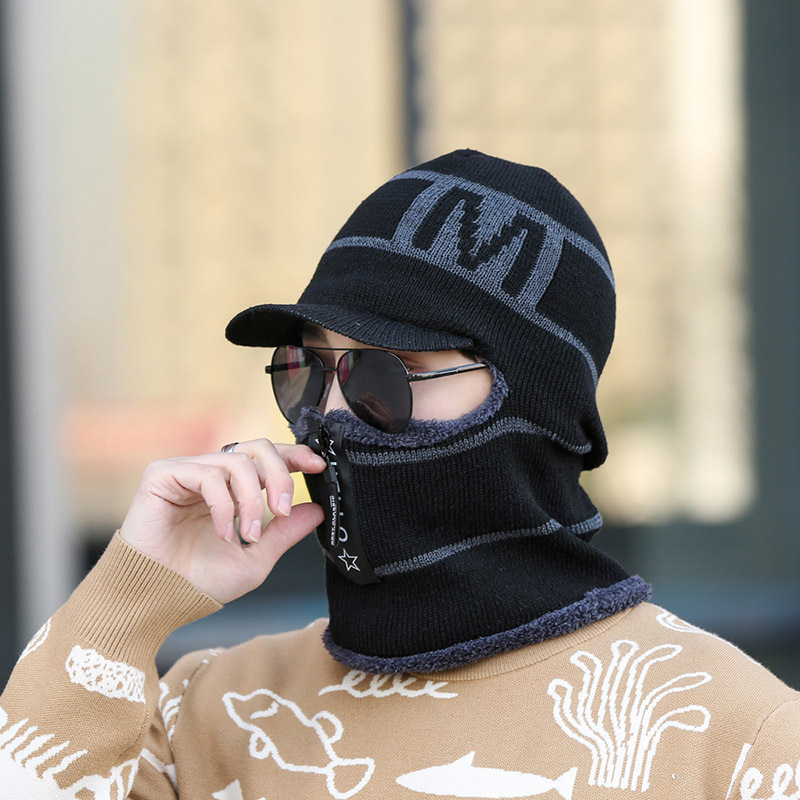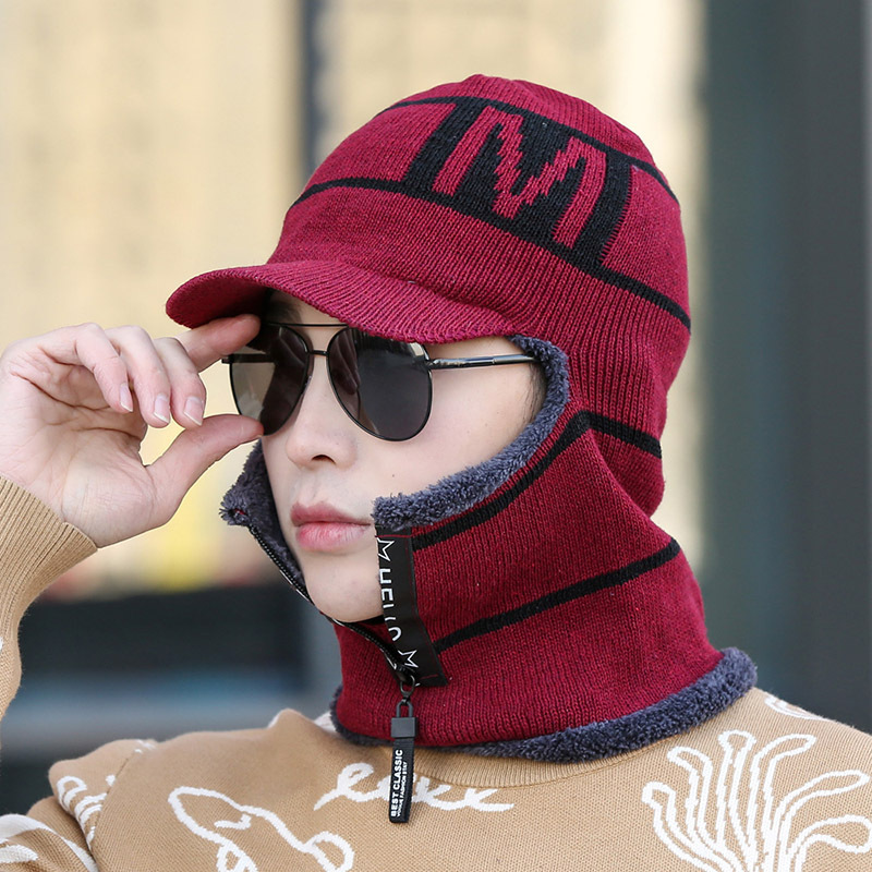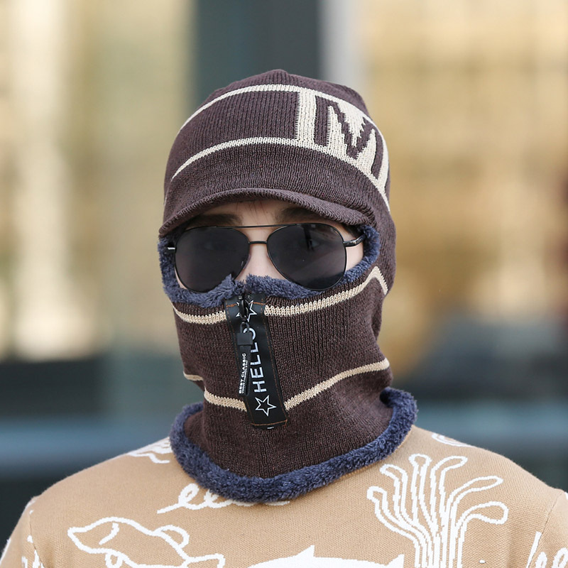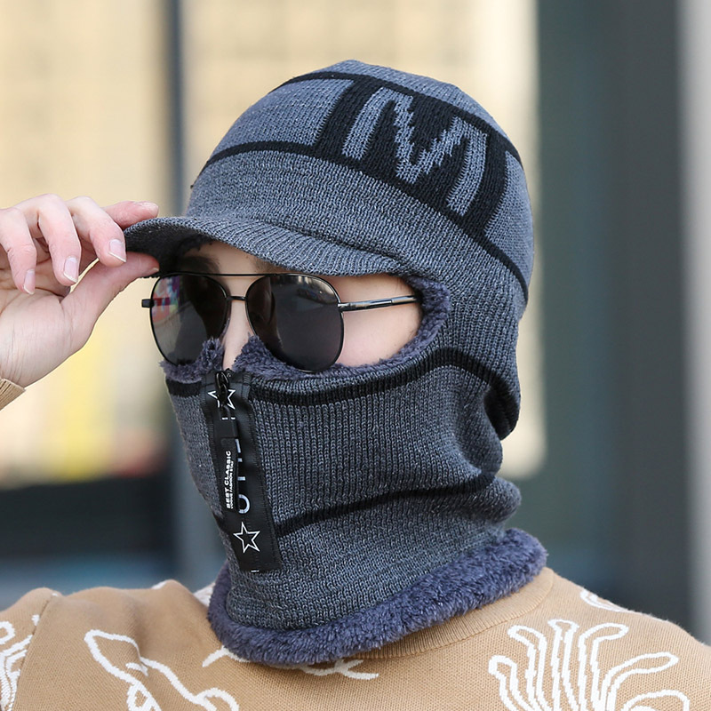 Winter plush and thick woolen men with a zippered head cover, knitted for women riding bicycles, windproof cotton hat