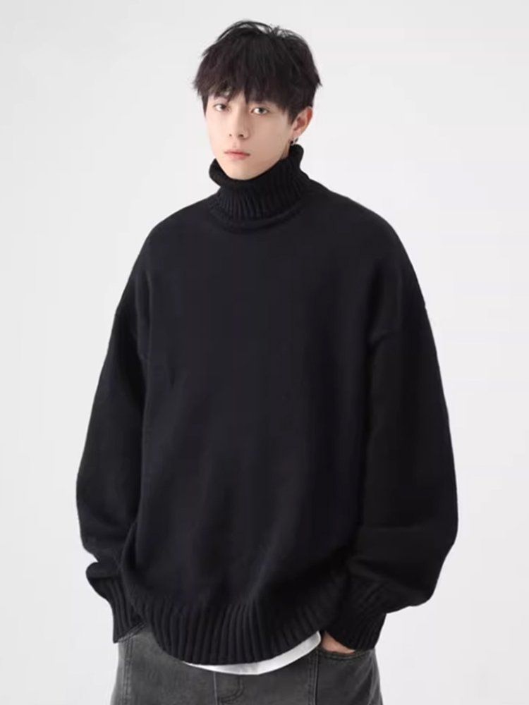 QOTRIOCK Turtleneck For Men Winter Loose Solid Color Fleece Lined Thickened Warm Couple Knitted Base Shirt Sweater