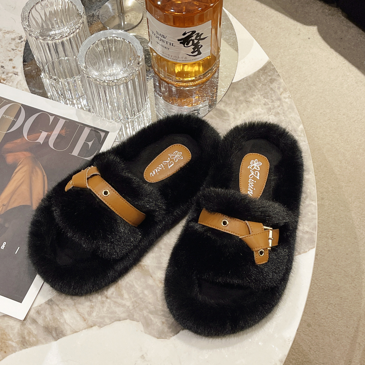 2023 Autumn/Winter New Type Plush Slippers for Women Outerwear Large Flat Bottom Belt Buckle Soft Plush Thick Bottom Cotton Slippers