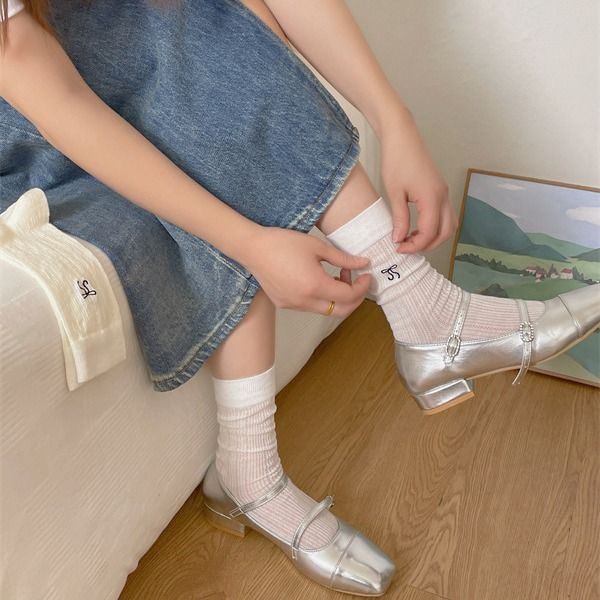 Spring/Summer Milk White Slim JK Women's Socks, Bow Mid Calf Ballet Style, Cutout Stacked Socks,