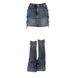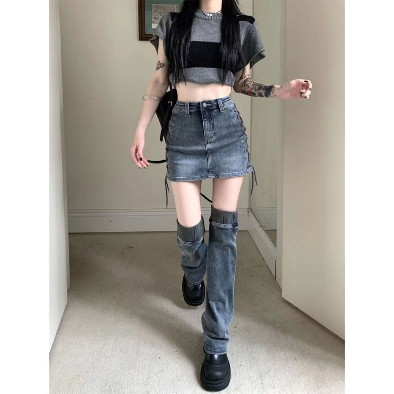 Verve Spicy Girl Denim Skirt + Leg Warmers Drawstring Design Two-in-One Split A-Line High Waist Bodycon Calf Socks