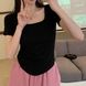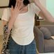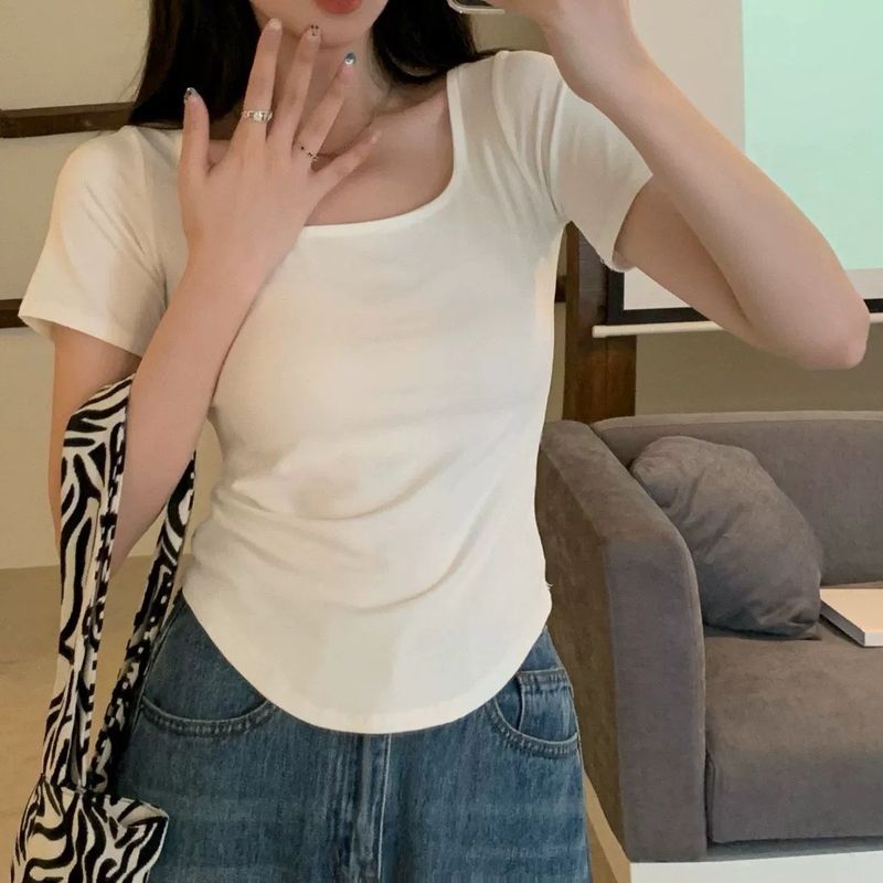 White short sleeved t-shirt for women in summer 2024, new style with front shoulders to cover the belly and show off weight. Spicy girl square neck short top trendy