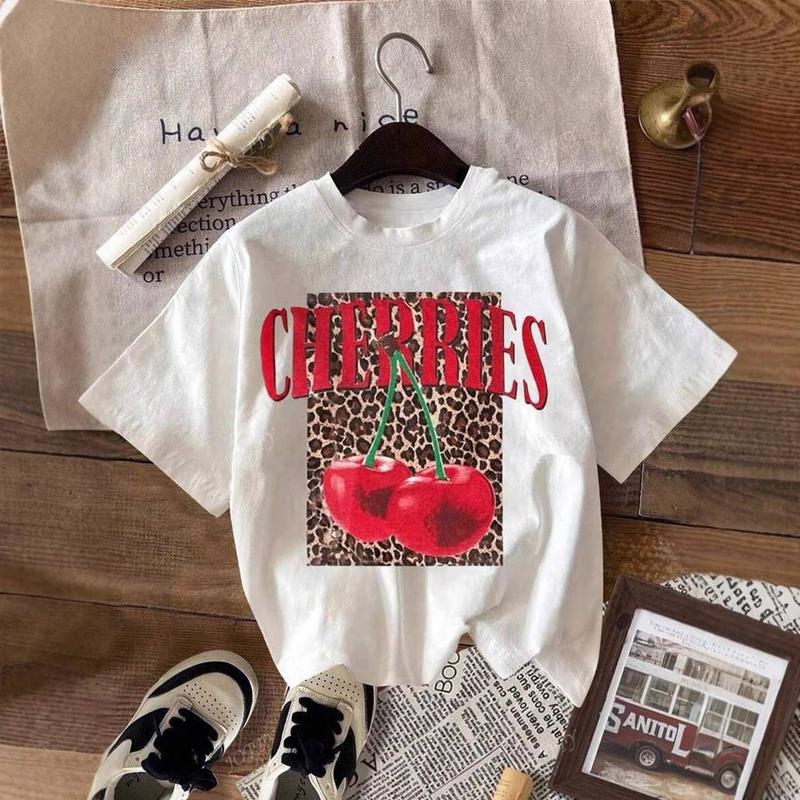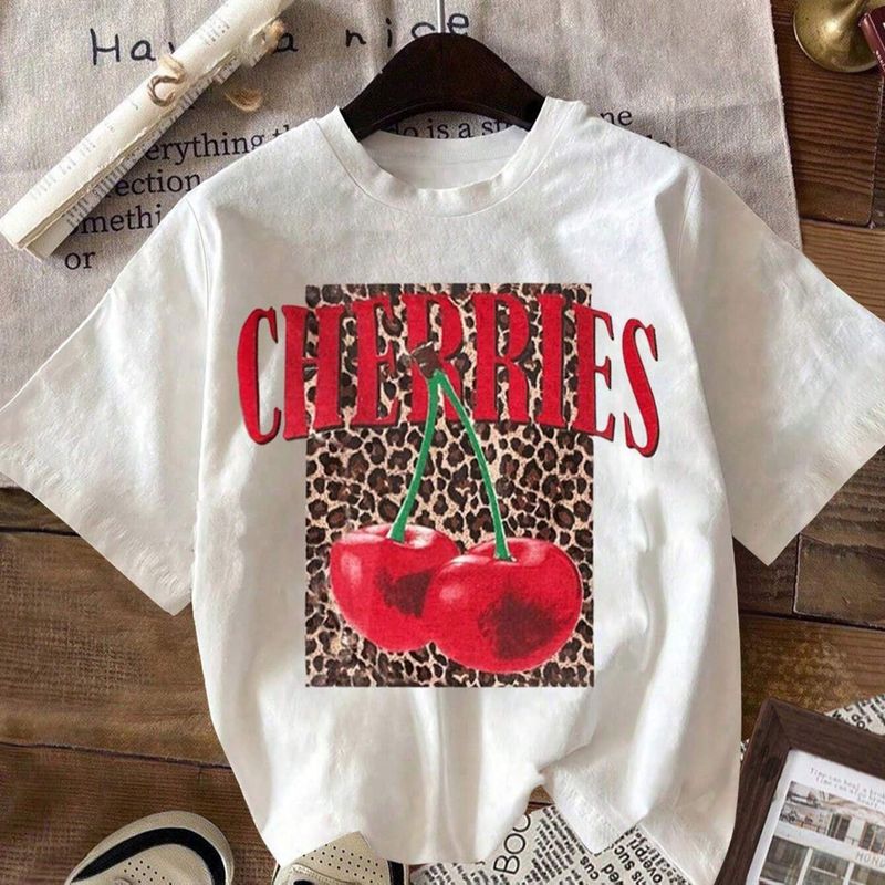 Make a statement wherever you go with this eye-catching leopard and cherry letter print tee. The vibrant pattern blends streetwise edge with playful charm, perfect for fashion-forward women who dare to be different.